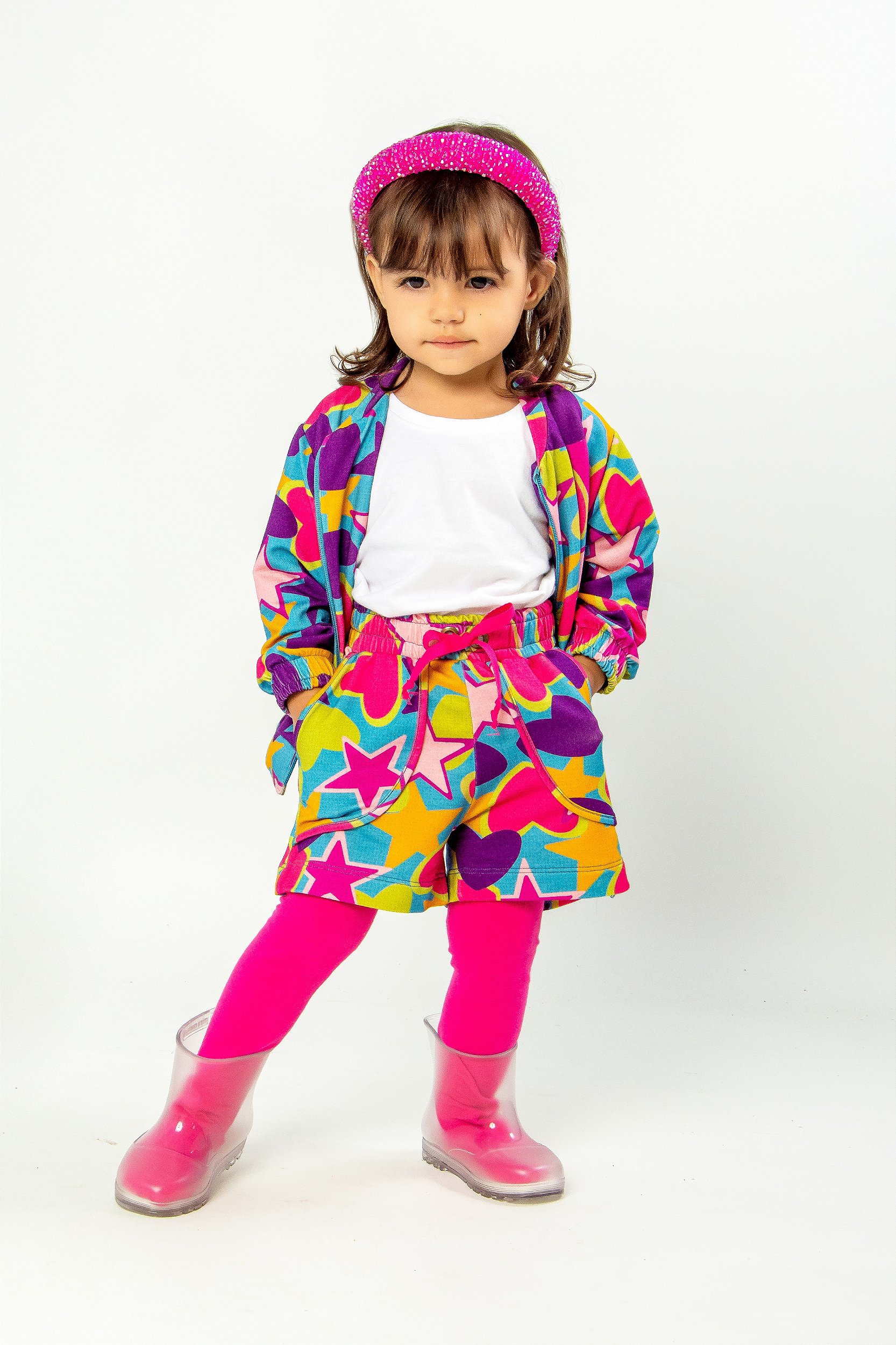 A estampa de estrelas e corações adiciona um toque mágico ao conjunto, estimulando a imaginação e criatividade dos pequenos. A jaqueta de manga longa oferece proteção extra em dias mais frescos, enquanto o shorts com cordão ajustável proporciona um ajuste confortável e personalizado.