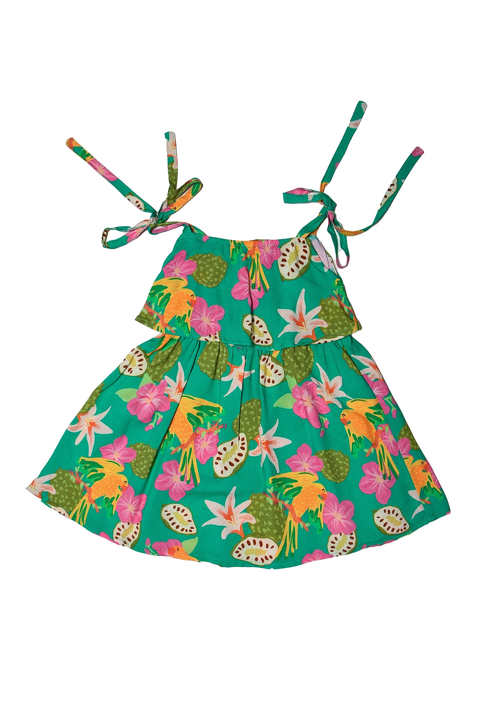 O tecido de viscose garante uma textura suave e fresca, o que torna o vestido perfeito para os dias mais quentes. Além disso, a estampa tropical acrescenta um toque de alegria e descontração, permitindo que a criança se sinta livre para brincar e se divertir.